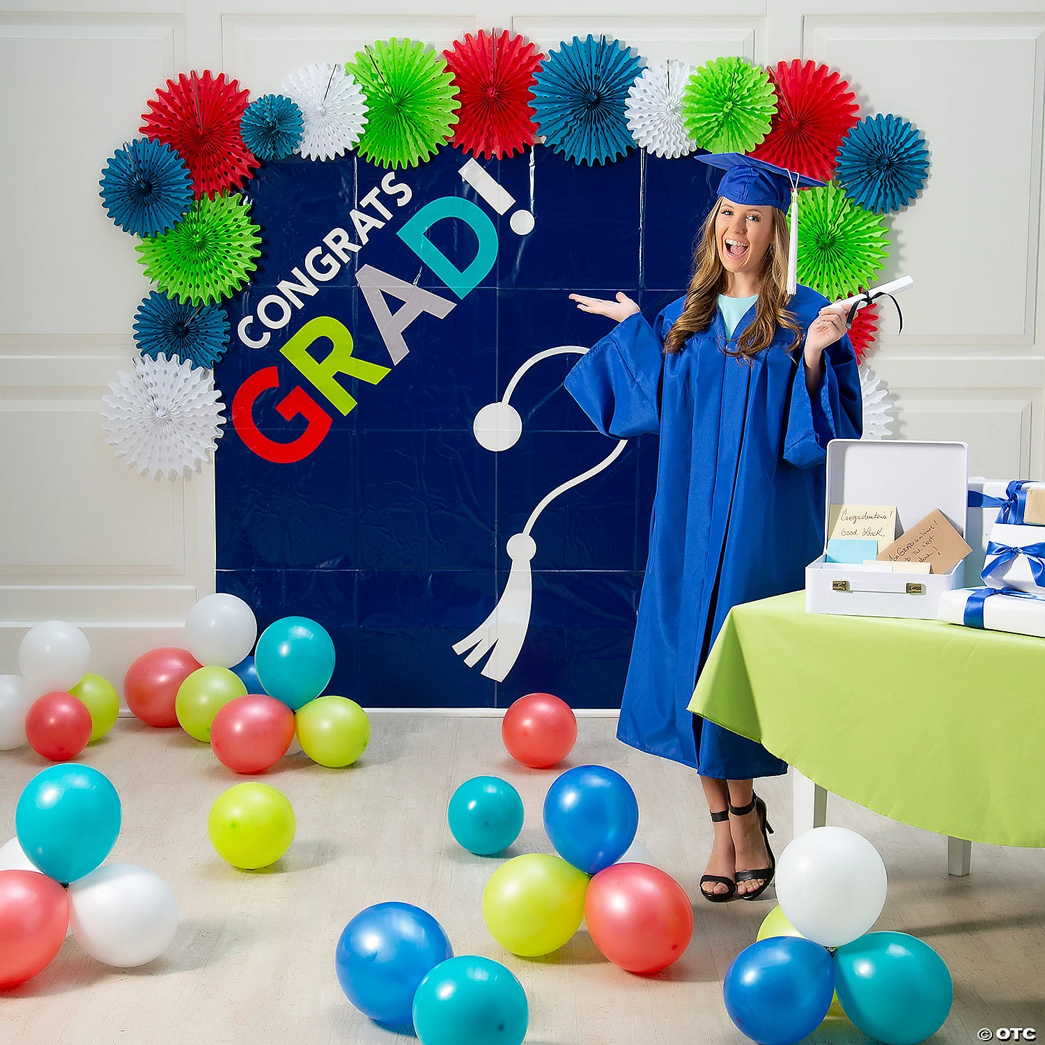 This graduation party background banner is the perfect backdrop for a DIY photo booth session! Whether celebrating the graduation class at school or at home, this backdrop is sure to set the scene for some party fun! Find all of your graduation party supplies and decorations throughout this site! Plastic. 6 ft. x 6 ft. © OTC