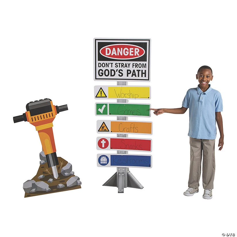 Danger! Don’t stray from God’s path! Guide kids through your Construction VBS theme with fun VBS supplies likes this directional sign and jackhammer stand-up decoration! Use permanent markers to write on the signs to direct little VBS construction workers around the space, and display the jackhammer cutout with other construction-themed decor. Cardboard. (2 pcs. per set) Sign, 24″ x 66″; jackhammer, 29″ x 41″. Jackhammer stand-up is one-sided with a brown cardboard back. Simple assembly required. © OTC