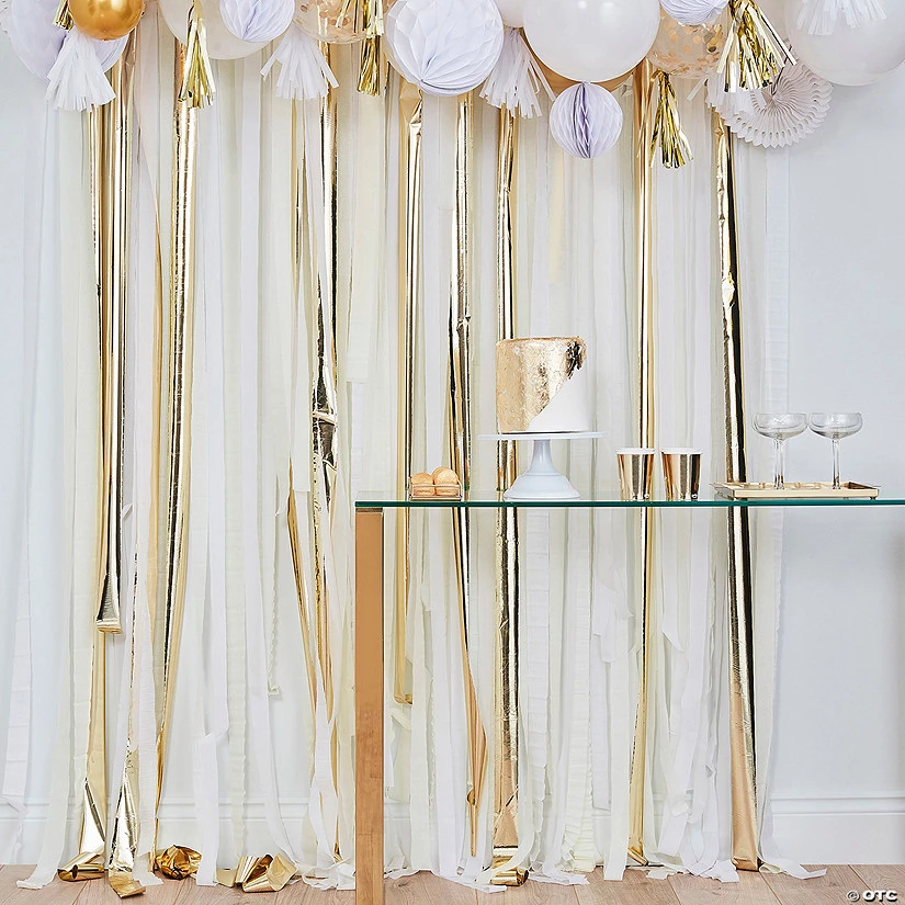 Create a vibrant backdrop party decoration with the help of this streamer kit. Perfect for bridal showers, birthday parties, baby showers, wedding receptions or any occasion you’re celebrating! Pair it with décor accents like hanging fans, honeycomb decorations or balloons for an added touch! Includes 6 white rolls, 5 cream rolls and 10 gold streamer rolls. Crepe paper. (21 rolls per unit) Each roll, 32 3/4″. Assembly required. © Ginger Ray Ltd.