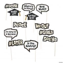 When you’re at a loss for words, let these props do the talking! An A+ worthy addition to graduation party supplies, these photo stick props feature witty sayings like “See Ya!”, “We Out!” and “Buy-Bye Now!” For academic achievers of all ages, these accents perfectly express their excitement to officially be done for the semester, summer or life! Paper. 6 3/4″ – 7″ x 3″ – 5 3/4″ props on 8″ wooden sticks. © OTC