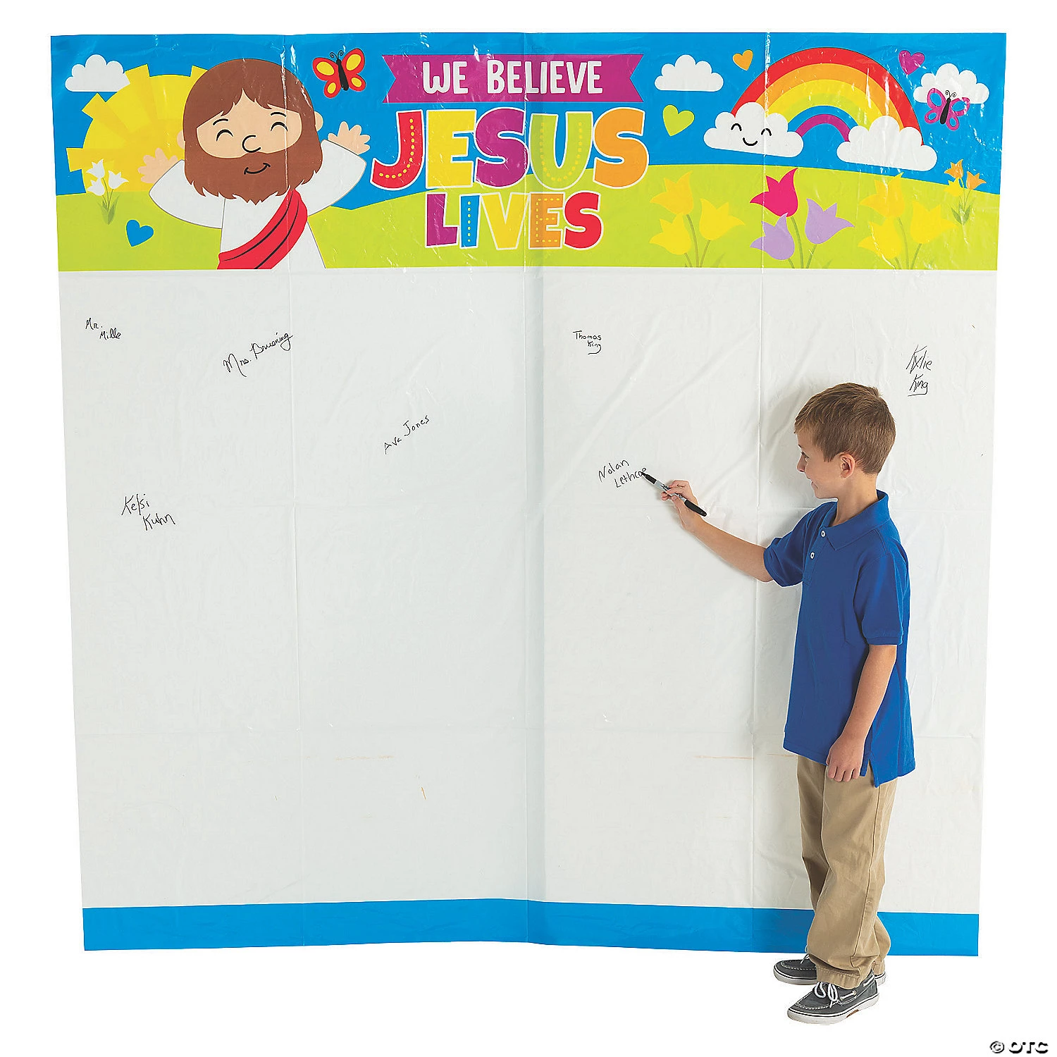 Create a memento to remember celebrating the most egg-cellent day of spring! Great for Sunday School classroom décor, this huge poster features a colorful cartoon image with text that reads “We Believe Jesus Lives” and enough room for all the students to autograph their names. This can also be hung at a church egg hunt for all the attendees to sign! Recommended for use with permanent markers to prevent smearing. Plastic. 6 ft. x 6 ft. © OTC