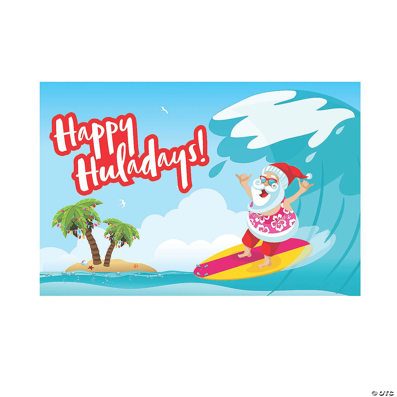 Hang ten, Santa! This surfing Santa Clause would like to wish you “Happy Huladays!” A unique Christmas party decoration, the wall backdrop features Santa riding a wave in the tropics. Use the Santa backdrop and other holiday party supplies to create a luau Christmas party theme. We recommend pairing it with hula skirts and flower leis for nonstop photo booth fun! Plastic. (3 pcs. per set) Assembled, 9 ft. x 6 ft. Simple assembly required. © OTC